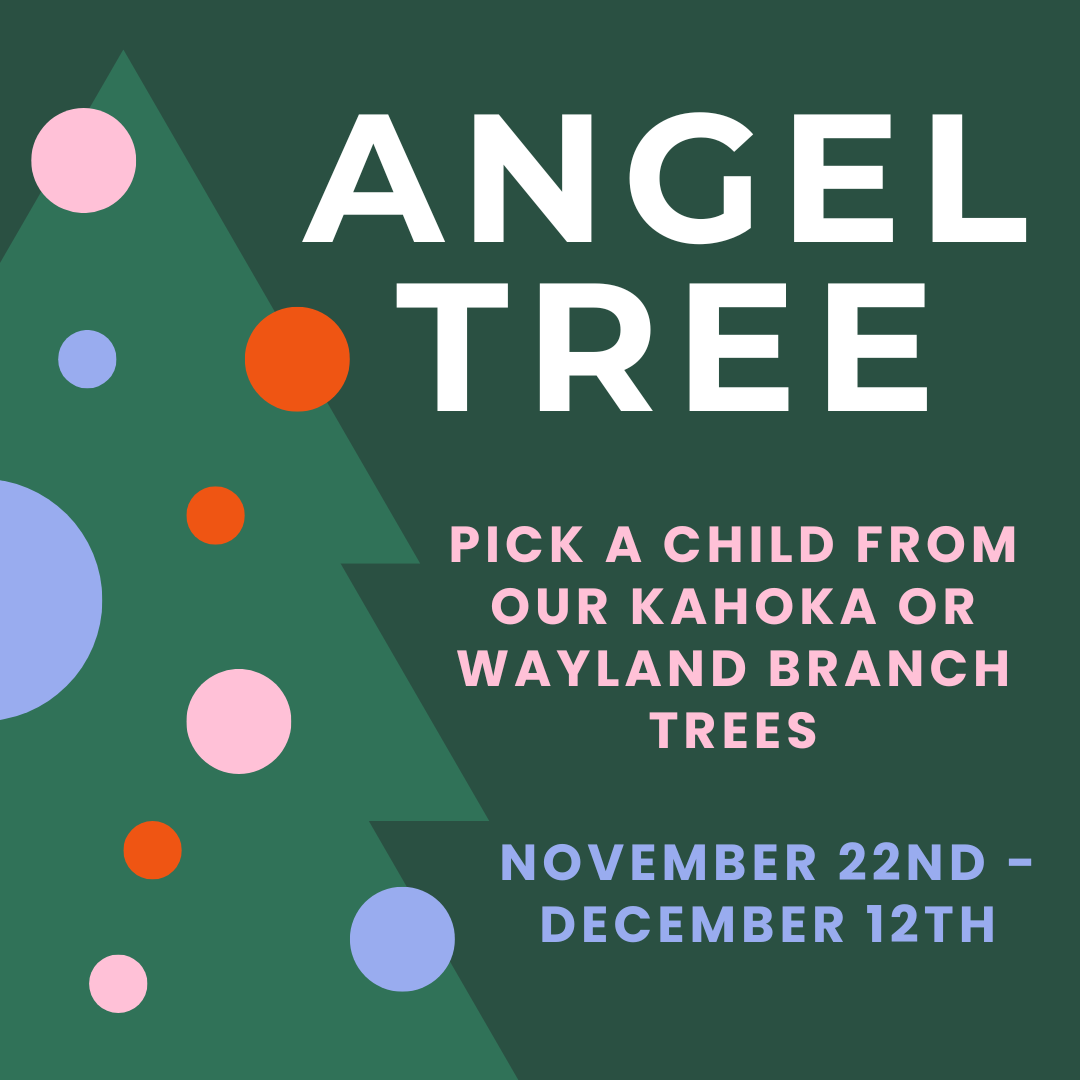 Stop by our Kahoka or Wayland branch to pick a child's wish list from our Angel Tree. All gifts can be delivered to Sever Library by December 12th.